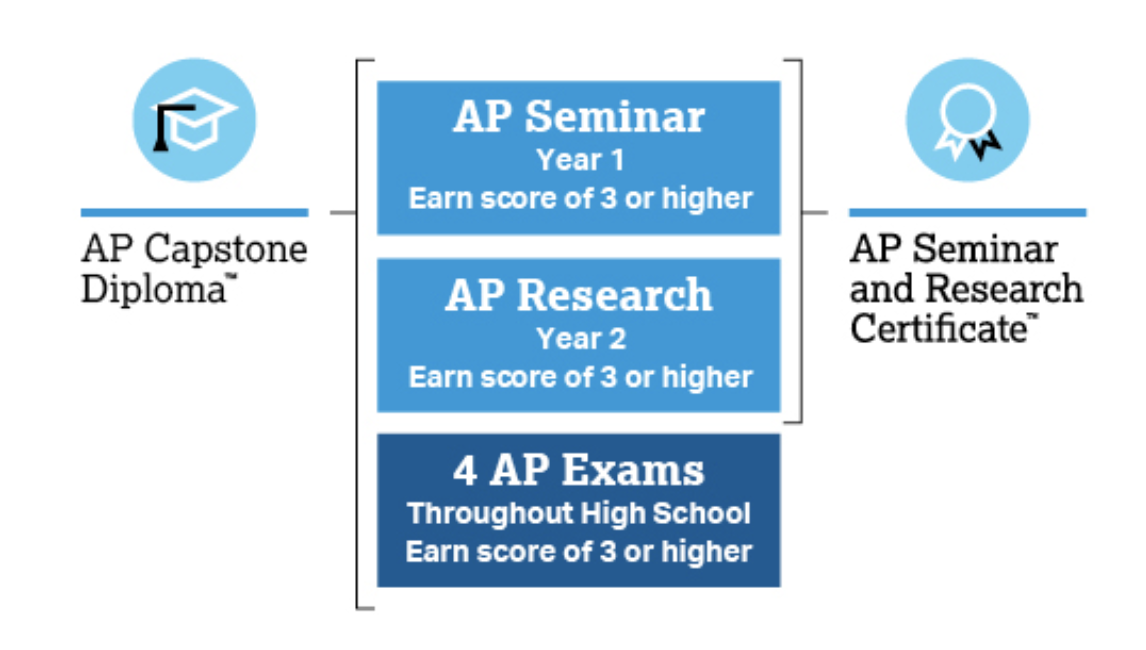 The AP Capstone™ Diploma recognizes students who complete AP Seminar and AP Research courses, score 3 or higher on the exams, and pass four additional AP exams. The AP Seminar and Research Certificate honors students who excel in Seminar and Research courses. Both awards are recognized nationally and globally for the advanced research, writing, teamwork, and presentation skills students gain.