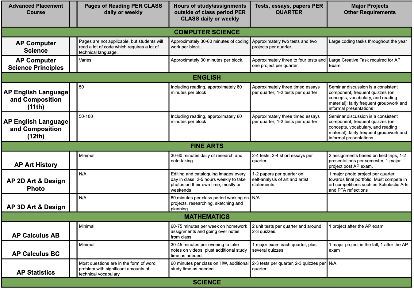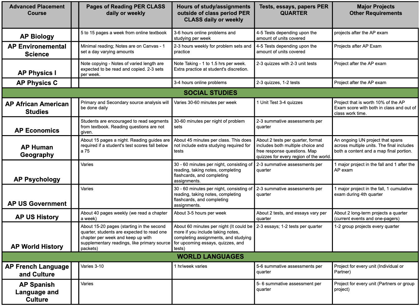The Advanced Placement (AP) program provides rigorous academic coursework in the major subject fields, with course content designed by a committee of college and high school instructors. Courses are offered in English, Social Studies, Science, World Languages, Math, Fine Arts, and in a multi-disciplinary program called AP Capstone. Wakefield High School offers 27 Advanced Placement (AP) courses and are open to any student who is interested in academic rigor. Students enrolled in Advanced Placement courses must take the identified associated examinations. By taking these exams, students have the benefit of possible college credit and consequent advanced standing if qualifying grades are earned. Fees for Advanced Placement tests for courses listed in the Program of Studies are paid by the Arlington Public Schools (up to 3 exams) if the student has been enrolled in the class for the current school year. To preview class descriptions and for more information about exam fees, please click the links provided below.